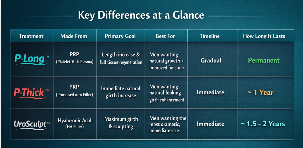 P-Long, P-Thick, and UroSculpt each address different aspects of enhancement.